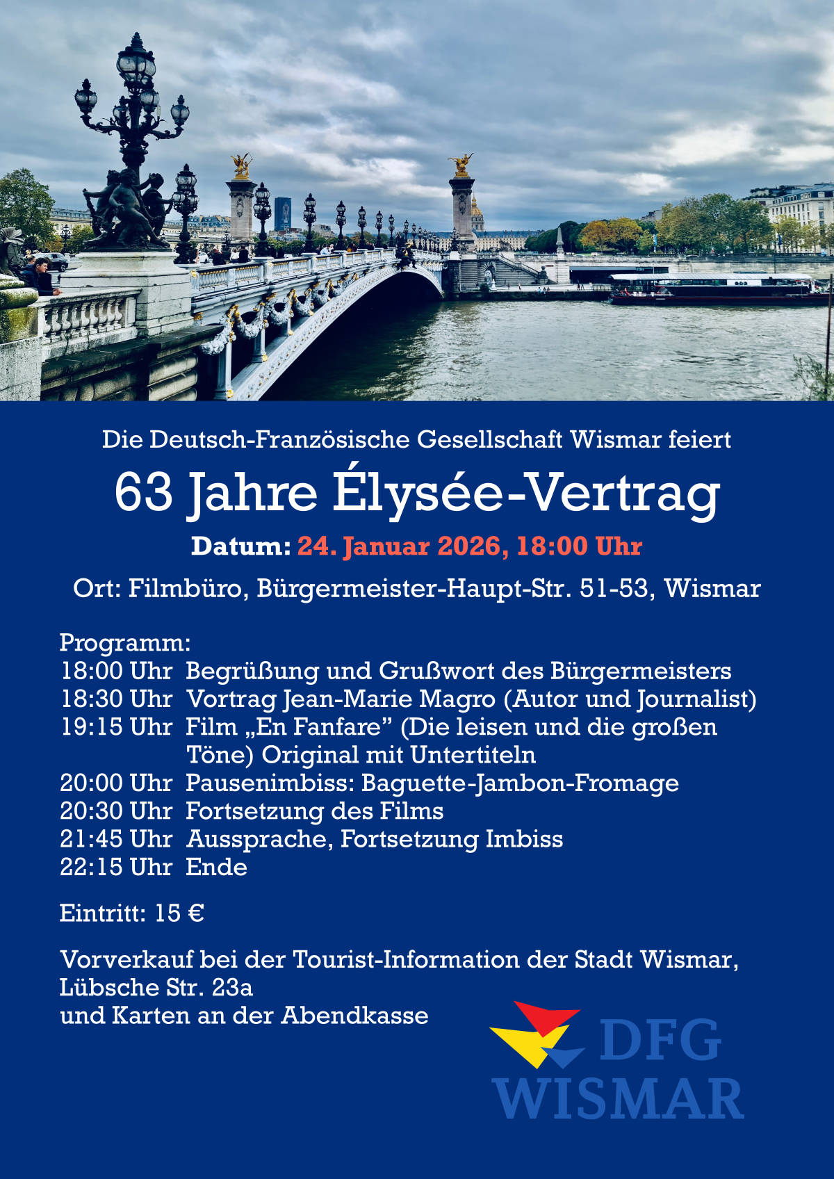 Das Fest erinnert an den 1963 geschlossenen Freundschaftsvertrag zwischen Frankreich und Deutschland. Dazu werden wir wieder einen interessanten Vortrag zu den Deutsch-Französischen Beziehungen hören, einen aktuellen französischen Film in Orginalfassung mit Untertiteln sehen und in der Filmpause ein von unseren Mitgliedern organisiertes Buffet genießen. Dazu gibt es freie Getränke.